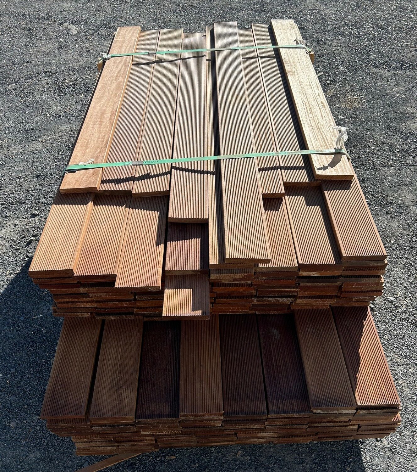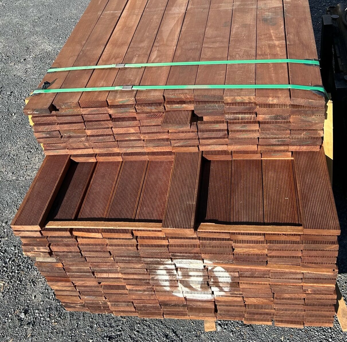 lames de terrasse en IPE classe 4 bois très résistant, sans nœud, 1 face lisse, 1 face striée ; généralement on pose le coté strié visible ; les lames sont un peu grisées suite à une exposition au soleil.