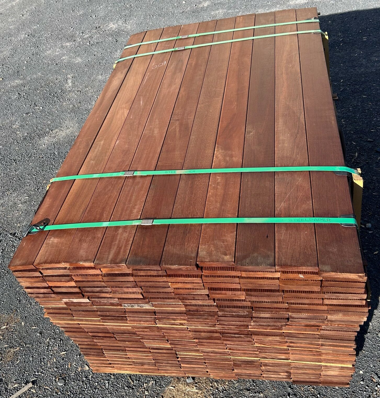 lames de terrasse en MASSARANDUBA classe 4 bois très résistant, sans nœud, 1 face lisse, 1 face striée ; généralement on pose le coté strié visible