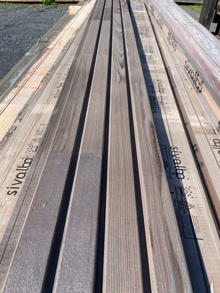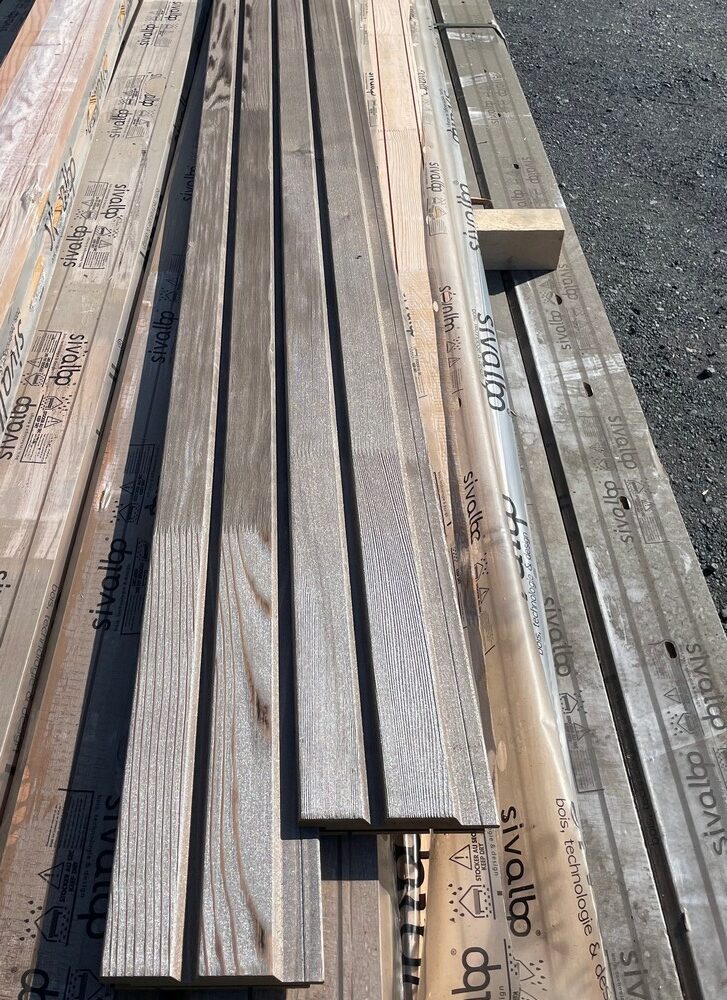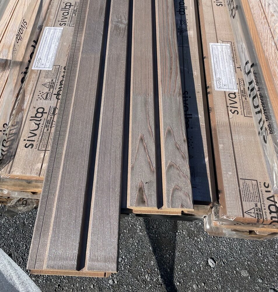 – lot de 13.50 m² à 450 € TTC (soit 33.33 € TTC / m²) Faux Claire Voie Thermo-brossé, saturé gris 102 en 27 x 125 mm x 4.50 m (il s’emboite aux extrémités)